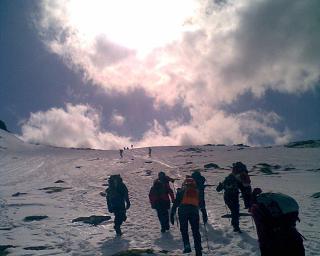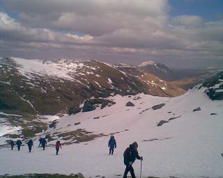 We walked form the Bridge of Orchy Hotel in glorious weather on a good path toward the bealach between the two mountains. There were twenty two people in the group so lots of new people to chat to on the way. As usual, the walkers were a sociable bunch and I regularly walked alongside different people as there were lots of stories to hear. They were all very friendly and happy to see a new face. We stopped near the burn for a tea break and to admire the views of the mountains all around. There was then a fairly steep path to the bealach where the weather was considerably colder at the higher altitude so sheltering behind some rocks, it was on with the windproof gear. It is a fairly long ridge but with a good path and we soon reached a steep snow slope. The walking was easy as there were many walkers out in front of us and they had kicked steps in the snow. There had been a late dump of snow so the snow had held on the north facing slope of Ben Dorain