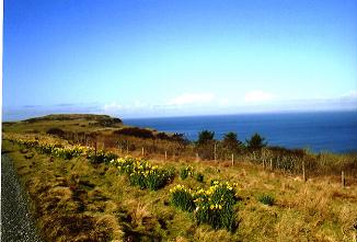 There was a good path all the way on the walk and the terrain at the start passed hedgerows of lovely clumps of daffodils. The path passed around a headland with a dramatic drop to the shore reminiscent of the Giants Causeway in Northern Ireland. On the beach there were interesting rock pools full of little sea creatures. We spent some time on the rocky beach looking round the pools and examining the flotsam and jetsam. Wearing walking boots was infinitely sensible to clamber over the rocks an avoid injury to the ankles. Having spent some time on the beach, we returned to the grassy area around the path to have a packed lunch and look over the sea to the Treshnish Isles. The weather was warm and sunny so most of us enjoyed a post lunch nap! It was Easter Sunday and chocolate eggs were rolled wherever possible on the grassy slope.