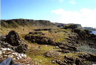The walk resumed along the headland past a steep dramatic waterfall from the escarpment and we finally reached the end of the path with only large rocks ahead. We could have returned the same route but opted instead to climb up the escarpment and along to the derelict village of Glacgugaraidh abandoned a long time ago after a smallpox epidemic. We continued walking over the grassy areas passing a trig point to the start of our walk so completing a circular route.