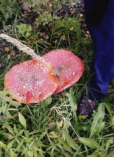 The first day’s walk was fairly near Laggan and was a circular walk which Stephen had spotted in the Herald Newspaper. It started from the Spey Dam (the River Spey is here and gives its name to Speyside malt whiskies). At Sherrabeg we ascended a hill on rough ground to a deer fence then along the side of the forest to Loch na Lairige. There was a deer fence to cross without a stile which was quite challenging. It was then steep uphill to Creag Ruadh minor top and further on the Creag Ruadh proper where there were views over the loch to the castle in the glen known as Glen Ogle in the television series Monarch of the Glen. Now we were on a path down through the woods to Dun da Lamh, an ancient hill fort. The walk under the hill fort brought us back to the road where there were giant red mushrooms on the grassy verge. It was a very enjoyable day with only one short heavy burst of rain.