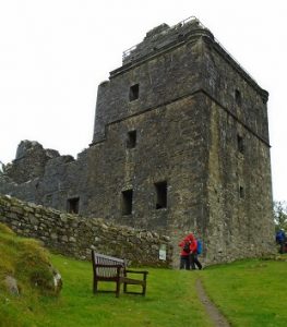 After visiting Dunadd Fort, we drove on to Kilmartin Village for a walk to Carnasserie Castle. It was very wet by now so we moved at a pace through the countryside and up to the Castle. Carnasserie Castle (also spelled Carnassarie) is a ruined 16th-century tower house noted for its unusual plan and renaissance detailing. The castle was built by reforming (Protestant) churchman John Carswell who was Rector of Kilmartin, Chancellor of the Chapel Royal at Stirling, and later titular Bishop of the Isles. Carswell published the first book to be printed in Scottish Gaelic, a translation of John Knox’s Book of Common Order. Construction began in 1565 using masons brought from Stirling. Although notionally built for Carswell’s patron, the Earl of Argyll, he intended it as a personal residence for himself. In 1690, the castle was burned down in a feud. Although the outer walls remain largely undamaged, Carnasserie was never rebuilt. It is open to the public to climb on to the top but was closed on our visit so we missed the views over the countryside.