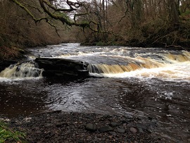 We continued through the woods with the river known as Mousewater to our side. It is pronounced Moosewater and is a tributary of the River Clyde. It is popular with canoeists. In the past, the fast flowing river was used to power mills and factories along its route and is still used today to produce hydroelectricity. There are bridges where the roads cross the river and these are built of stone. The sides of the river were originally red sandstone but this has been eroded over the years. The trees are still coppiced to let in the light. There are rapids and we stopped near one for lunch where there were convenient logs placed to sit on.