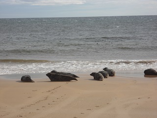 The walk along the beach led us to the grey seals at the sea edge relaxing with the pups in their inimitable way. We were careful not to go too close to them as the pups were too young to go in the water and we did not want to panic them. However, we were able to take excellent photos and watch their behaviour. The beach is of beautiful white sand and the sea colours reflect a changing sky. We also saw Oystercatchers in flight.