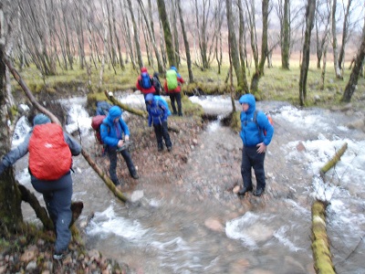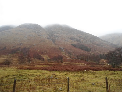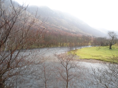We continued along the riverside path which was very boggy and squelchy and we reached a very wide burn that had to be crossed by stones that were almost covered in water. I am not great or confident at crossing burns particularly as wide as this one but the high level walkers were on hand to give assistance in trying to take large steps from stone to stone. When I reached the other side, I was amazed to look back and wondered how I managed to cross it so a big thank you to all the helpers. At this point my feet were still dry but little did I know there were many more burns to cross as it had been wet for days and, although mild, it continued to drizzle. We were aware we were surrounded by mountains such as Sgurr a Mhaim and Stob Ban but we could not see the tops.