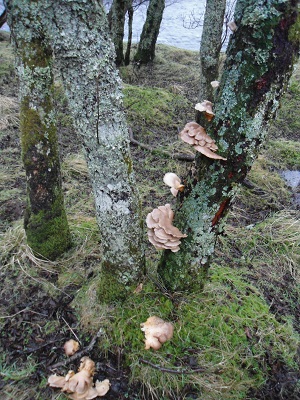 The burn crossings continued and at times we had to walk further uphill to find an easier crossing place as the burns were raging torrents, . At one burn I put my walking pole into the water for balance and it went down a hole which knocked me off balance and into the burn! Many rescuers rushed to my assistance and helped me out but not before I was very wet as my jacket was undone. Fortunately, it was not cold. It was all fun and everyone was in good humour despite the damp. We continued on the path passing below the old walled burial ground of Ach nan Con which had old deciduous trees. There were very unusual mushrooms growing like little shelves on the tree trunk.