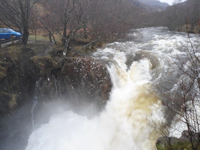 Eventually we reached the bridge over the river at the Polldubh Falls where the rushing waters of the River Nevis plunge over a ten metre drop. We turned at Achriabhach cottage onto the forest track and after lunch walked quickly back on the forestry track to the start of the walk as we were now on the other side of the river. The falls were certainly impressive after all the rainfall. It was a wet walk but very enjoyable with all the camaraderie and the help given on the burn and fence crossings. The barbed wire on the fences was vicious and usually on the top so can easily rip waterproof trousers.