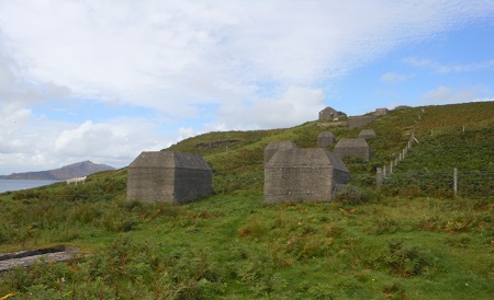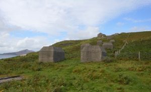The mines that were dug here were worked mainly during the First World War period by German prisoners of war employed for that purpose. The mineral diatomite (known locally as ‘Cailc’ – Gaelic for chalk) was extracted, kiln dried, ground and calcined on site to eventually be used to create dynamite for military purposes. A row of ruined former workshops and offices lie open to the elements, as are the remains of the one-time power house.
