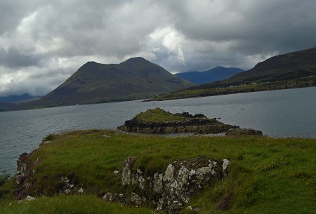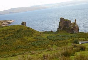 On the second day we were in the north east of the island and admired the ruins of Brochel Castle a late 15th/early 16th century occupied until c.1671. It was an impregnable stronghold and an ingenious fusion of natural rock and masonry rising sheer from a stack-like volcanic plug some 15 metres high. Built, so the favoured tradition goes, by Raasay’s first Macleod chief, Calum (MacGilleChaluim), it provided a strategic base for a dynasty of reiving seadogs to control their mainland possessions and the Inner Sound. Even today, with masonry eroded to precarious stumps; it is easy to see why Brochel has often been depicted as something born of realms fantastical. Though only footings survive of the tallest tower, which rose to corbelled battlements (Daniell’s view of 1818 depicts it virtually intact), remnants of three other tower structures on different levels still conjure up a thrilling spectacle. Entrance was via a steep ridge leading up from the east to a narrow cleft between projections of rock and masonry, with sheer drops on the other sides.