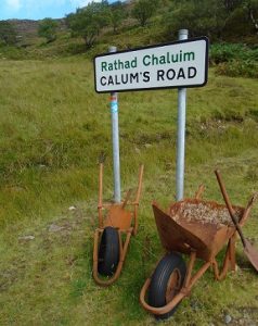 After decades of unsuccessful campaigning by the inhabitants of the north end of Raasay for a road, and several failed grant applications, Calum decided to build the road himself. Purchasing Thomas Aitken’s manual Road Making & Maintenance: A Practical Treatise for Engineers, Surveyors and Others (London, 1900), for half a crown, he started work, replacing the old narrow footpath. Over a period of about ten years (1964–1974), he constructed 13⁄4 miles (2.8 kilometres) of road between Brochel Castle and Arnish, using little more than a shovel, a pick and a wheelbarrow. Initial blasting work was carried out and funded, to the sum of £1,900, by the Department of Agriculture’s Engineering Department, who supplied a compressor, explosives, driller, blaster, and men.
