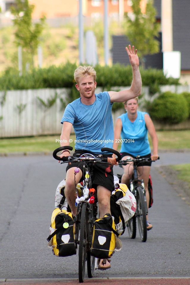 I am married to a woman whose first husband is in a state of very high dependency due to Huntington’s disease. Unfortunately, both her daughters also carry the defective gene, which indicates that they will eventually develop the symptoms of the disease. We, therefore, had an additional motive for hosting this young man. When I read his blog, I found out about the various receptions he had received by dignitaries and representatives of local HD charities in places he had visited. I felt I should make arrangements for his arrival here to be publicised as a way of raising awareness of the disease. I spoke to a reporter from the local newspaper and contacted Renfrewshire’s Provost Anne Hall and John Eden of the Scottish Huntington’s Disease Association to sow the seeds of an idea for a photo call involving the cyclist . The day before he was due to arrive I was leaving on a prearranged holiday, cycling with friends in Holland so I had to ask my wife to handle the event.
