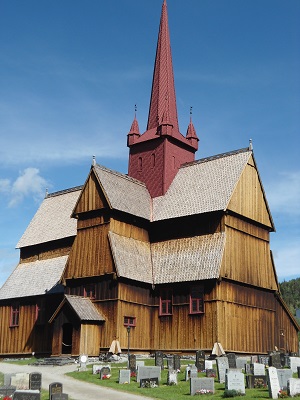 On our one day not walking, we were tourists and visited the Stave Church in the valley at Ringebu. Stave churches have vertical posts and wall planks resting on sills known as a stave wall. Ringebu church dates from 1220 and is one of only 28 stave churches surviving. After the reformation, the church was rebuilt and the characteristic red tower added. The statue of St. Lawrence dates from 1250. The Old Vicarage at the rear of the Church is an important arts and crafts display area.