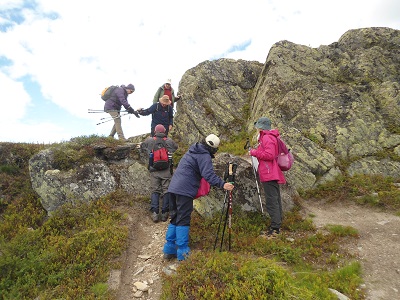 We had walks on five days of the trip and all were varied. I shall pick out the highlights to describe them. On the first day we walked from the hotel to Forestadsaetra and passed the bridge famous in the children’s story the Three Billy Groats Gruff which is a Norwegian Fairytale. A fearsome and hideous troll lived under this bridge. Trolls are part of Norse Mythology and Folklore and are usually ugly giants. Our destination was the Myfallet waterfall at 1,034 metres. The trees were in full leaf and obscured the waterfall but it was a lovely walk in the forest. Trails are rarely flat and we did a fair amount of ascent and descent on the easy walks.