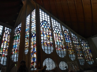 On the square, a new church was built dedicated to Joan of Arc in 1979 and although it is built in a circular modern style it incorporates traditional stained glass from the 16th century Church of Saint Vincent, whose ruins are located a few metres away. The old church was almost completely destroyed in 1944 during World War 2 but the windows had been removed and stored in a safe location during the war. They were then incorporated into the Church of Saint Joan of Arc. It is rumoured that the local congregation did not like the new building but then decided it was much warmer than the Notre Dame Cathedral to worship in!