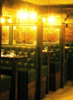 Booths divided by stained glass partitions, rugged exposed stonework and subtle lighting all create a subtle alchemy which makes the venue attractive enough by day but absolutely beguiling by candlelight.