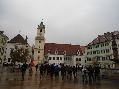 We stopped at Bratislava, the capital of Slovakia since it gained independence in 1993. In the past this was the capital of Hungary. The historic old town is a delight with a town hall dating back to the 14th century, the medieval St. Michael’s Gate, many Baroque Palaces and the narrowest house in Europe. It was rather wet the day of our walking tour so it was difficult to capture in photographs the picturesqueness of the town. The main square is Hlavné Námestie where you can find the Town Hall and the Maximilian Fountain, featuring a statue of Knight Roland from 1572. Roland was a popular and iconic figure in medieval Europe with its minstrel culture.